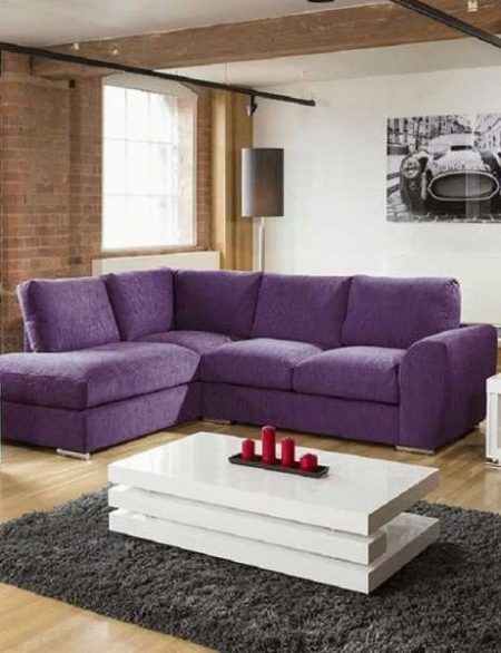 A purple sofa will look beautiful in an interior with a white or light gray wall covering and with a light floor. In this case, it is possible to imitate brickwork on one of the walls. This option will make the design more modern and interesting.