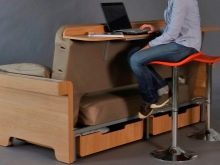 To make the transformer sofa harmoniously look in the interior, It must be selected taking into account the color scheme of a particular room. In this case, the color of the upholstery should not merge with the tone of the wall or floor cladding. So the furniture will look expressive and impressive. The color of the wooden poles should be in harmony with the tone of the elements of the existing furniture.