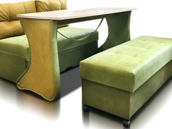 A seat with high legs in this case can become both a table and a berth. It is equipped with a thick layer of filler. Assembling a dining group into a sofa consists in shifting chairs with backs under the countertop from the sides. In this case, the seat blocks can be not only frame, but also frameless.