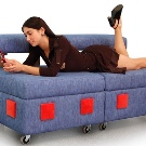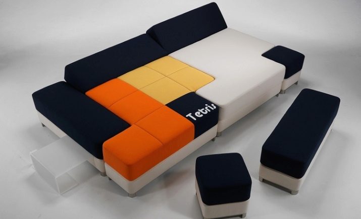 Modern high-tech development - modular (assembled from blocks) transforming sofas. This design promises truly unlimited design and practical possibilities. A striking example is modular transforming sofa "Tetris". To create it, a number of ottomans with soft upholstery and special holes were used.