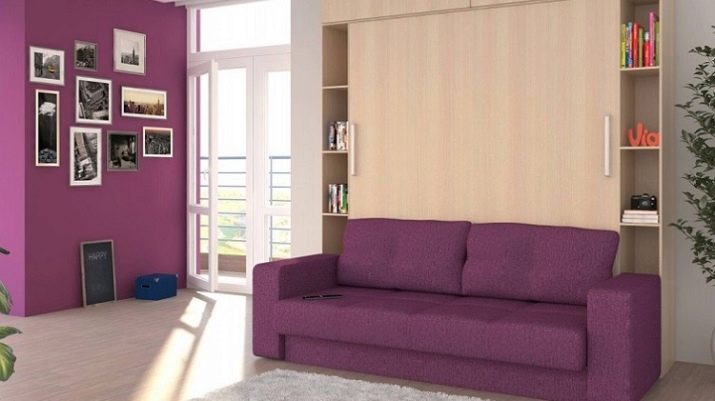 This photo shows an attractive closet-sofa bed of the latest generation. A skillfully selected combination of light wood and lilac tones in itself attracts. Visual duplication of the upholstery color in the wall color is characteristic.