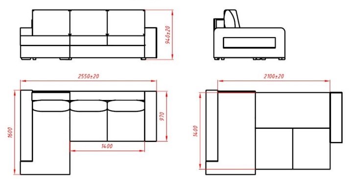 If we consider the dimensions as a whole, we should highlight the direct triple sofas. Their length can be from 210 to 240 centimeters with a width of 95 to 106 centimeters. The dimensions of the corner models are more impressive. The length of such products is from 200 to 350 centimeters, the width is from 170 to 180 centimeters.