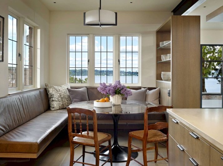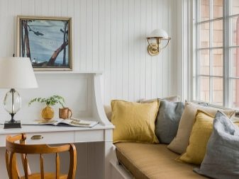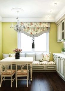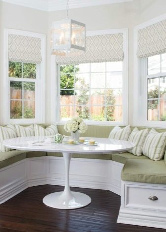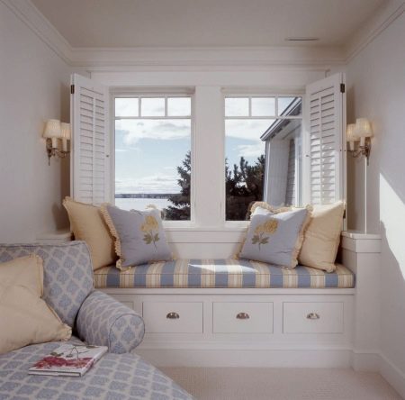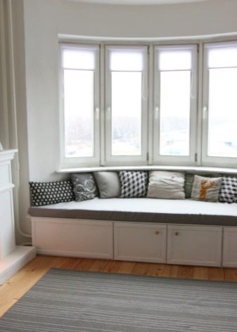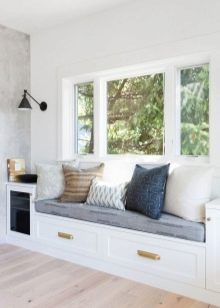 As for the options of the built-in type, then their choice is not so simple. Window sill models are built into the side walls of the bay window, choosing the width that is flush with the main wall. In fact, these products are nothing more than corner or straight cabinets with spacious storage systems located under the countertop. From above they are supplemented with mattresses of different thicknesses and sofa cushions, which form the walls.