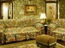 Inexpensive, but beautiful and durable material used as upholstery for bath sofas is tapestry. Products intended for use in high humidity conditions are treated with special compounds that promote fluid repulsion.