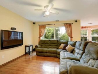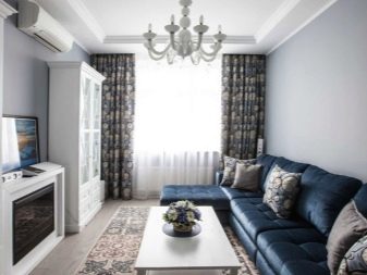 Traditionally, you can place a sofa against the wall, placing a TV zone opposite it.This option is suitable for small rooms of a residential type of urban apartments.
