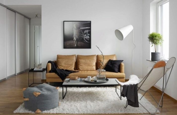 - An example of a good choice and placement of a sofa in the minimalist interior of a small room.