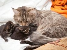 - Poor mom cat food. Maine Coon nursing females must be fed at least 3 times a day. It is necessary to give them special high-quality feed for lactating individuals.