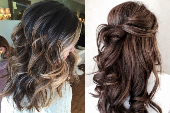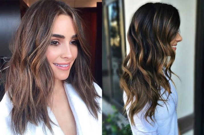 The novelty of the season is the tendency to use American highlighting with the application of soft caramel and chestnut shades on dark or even black curls. Most successfully, this effect looks with long, slightly curly curls.