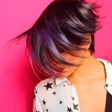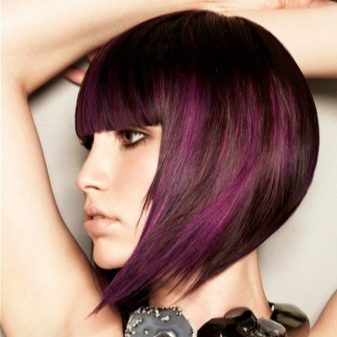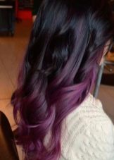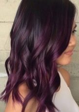 - Violet highlighting is a bold solution for impudent ladies who like to draw attention to themselves. This can be a spectacular gradient with a transition from a dark top to a light bottom of the hair or discreet dark purple locks in black curls.