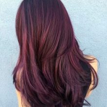 Highlighting on black hair using a purple hue is a great solution when it comes to painting long large curls. In this case, the bangs may be laid to one side or absent altogether. The tips are acceptable to make torn.
