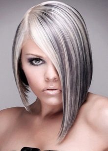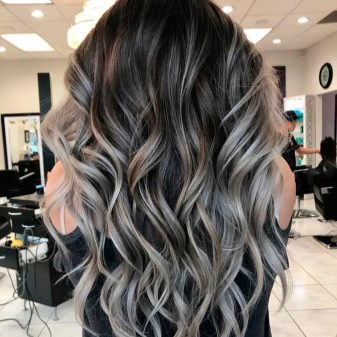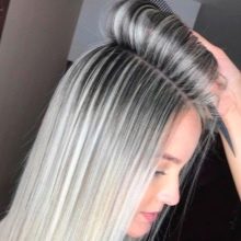 Highlighting using black and ash strands, smoothly turning into the dark top of the head, looks simply incomparable and trendy. The length of the lock can be any, as well as styling - the hair can be straightened or curled.