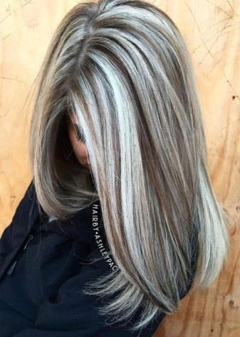 Frequent highlighting will look beautiful both on long curls and on those who prefer a shortened haircut. To hide the gray hair, you can use a very fashionable technique called "salt and pepper." Here, the gradient from white and light gray to black is almost invisible to the eye due to a set of very thin locks.