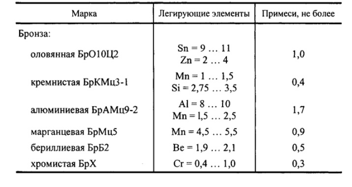 In order to distinguish bronze alloys from each other, a certain marking was introduced. And there are special technical tablesby which the technologist can determine which particular brand of bronze to use for performing a particular task, clarify tabular data on the composition of the alloy, its physico-chemical properties and application possibilities.