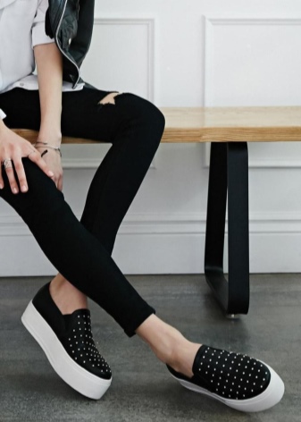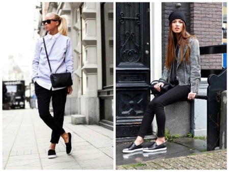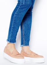 Two images with moccasins on the platform can serve as the basis for creating everyday bows. That model, which is on the left, demonstrates a more rigorous image in which elements of the classic are traced. So you can even go to work and let your colleagues envy you, who have to spend all day in high heels. And your legs will rest and in the evening you will not want to throw off uncomfortable shoes.