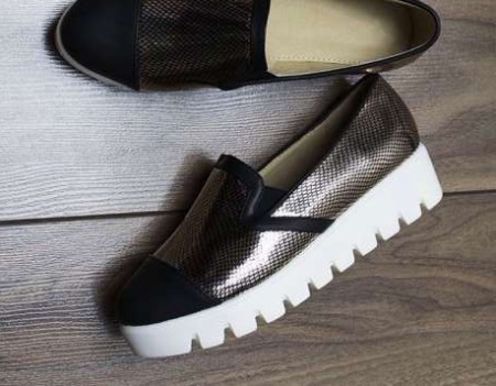- Moccasins-slippers came from slippers worn by noble British nobles. To create them, the best velvet was chosen and the heraldry of the genus to which the owner belongs was necessarily applied.Designers combined such slippers with a high platform, resulting in an interesting variation of moccasins.