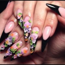 Modeling is especially popular - volume elements are formed on acrylic nails. As a rule, the surface is covered with a variety of patterns, natural elements, symbols and colors.