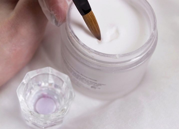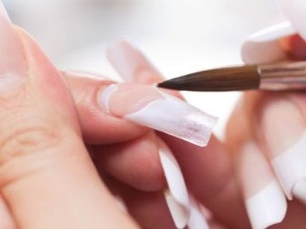 Having processed both hands, it is necessary to cut off the excess, strip off the excess shine to a matte white color and try to make the border invisible.If dust appeared at this moment, then it should be brushed off with a special brush. Following this, each nail is degreased, primed and left to dry completely. With the help of a brush, acrylic and monomer, a gradual treatment of the hands begins. The tool is dipped in a strengthening solution, and then in acrylic so that a ball forms, after which the coating forms on the little finger from its end to the hole.