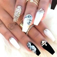 Beauties with a romantic character often choose lace and flower patterns, hearts as decoration. Strips of gold or silver foil or sparkles can emphasize the sophistication and elegance of the image. Often extended matte nails shine with rhinestones and stones, abstract ornaments and sparkles.