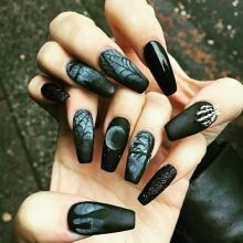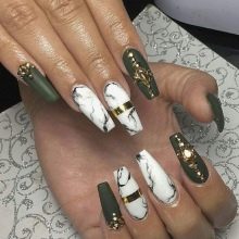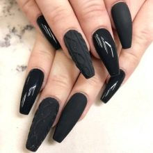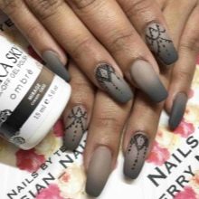 The elongated shape of nails is a real gift for a woman. The extended nails are no less spectacular, sometimes they can not be distinguished from natural ones. On the extended nails, you can realize the most daring fantasies. For example, matte tips go well with ornaments made with glossy varnishes with a brush or dots.