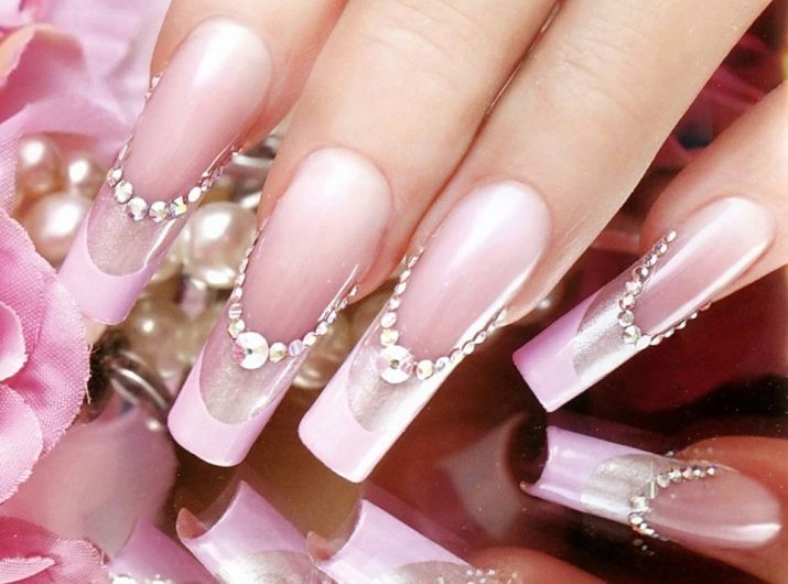 - The graceful length combined with the “smile” line in two delicate colors emphasize the delicacy of the fingers. Rhinestones, lined up in a french line, will add a solemnity manicure.