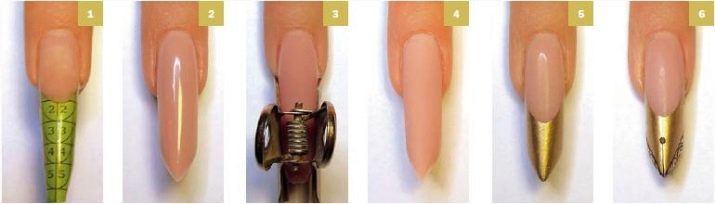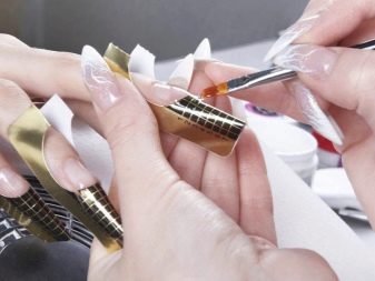 Modeling using forms (templates) is carried out on short nails. Their main advantage is that they allow you to give your nails any shape and length. This method is relevant for ladies with wide and curving down plates. The form is easy to attach and perfectly repeats the shape of natural nails.