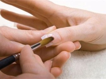 - the nail is degreased, the glue is applied to the area of the contact zone and distributed with a brush; make sure that it does not spread, so they keep the tips at an angle of 45 degrees;