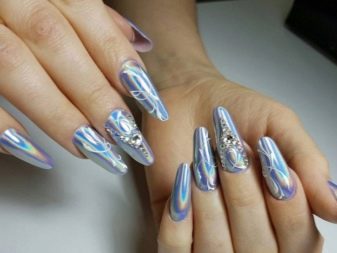 If you want something else, you can change the texture of the coatings of classic manicure. An excellent solution for this would be acrylic powders and rubs. At the same time, powder can not only cover the entire area of the extended nails: they are good for creating voluminous curls, monograms, lace, flowers. As for the cages, they look great on elongated nails of the varieties "May beetle", "mermaid" and "holography".