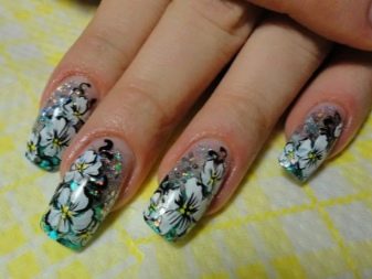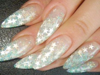 On the extended nails, Yuki's sequins look great, which are a kind of flakes in the form of rubbing. Today it is one of the hits of modern design, which allows you to give your nails a unique texture. It is very popular to decorate artificial nails with a dot pattern, which is created using a dot with different nozzles. It can be various ornaments, this technique draws a smile in a jacket. Sometimes the extension is performed with a variety of sparkles, mixing a modeling gel with various glitter. For greater shine, two shimmer layers can be used in the work.