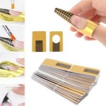 For the second method of nail extension, special forms are used - matrices. They resemble oblong substrates with a small hole for the nail itself. This substrate is fixed to the surface, while regulating a good fit. Then a special gel is applied, thanks to which the edge is formed, that is, the length is indicated. For convenience, and so that they are all of the same length, a special delimited “ruler” is drawn on the matrices, according to which the desired length can be measured.
