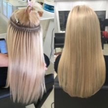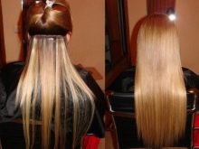 This method is also considered safe and is allowed even during pregnancy. During this procedure, the hair is injured the least, and the absence of exposure to high temperatures makes it completely harmless to your curls. The strands are attached with a special adhesive tape, which makes it possible to remove them at any time without resorting to the help of a wizard. The fastening time takes less time, the price is lower than that of the capsule, but the hair wear period is only two months.