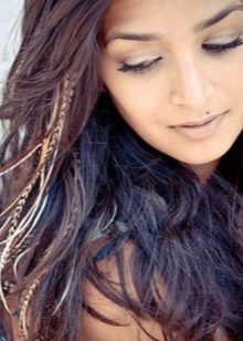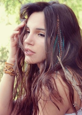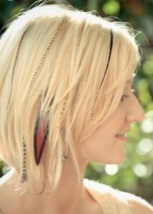 In search of original ideas, many young ladies turn to unusual feather hair extensions. This method can be called partial, because natural hair is diluted with a certain amount of feathers. So, about 3-5 feathers are quite enough for a short lock. Their color can be almost any. There are a lot of options for this build. It looks very fresh and unusual.