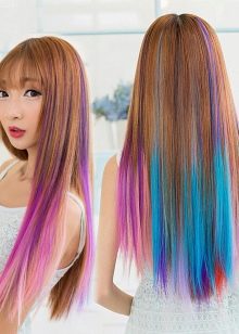 Color strand extensions are another popular and fashionable solution., which is addressed to courageous girls who want to emphasize their bright personality. Multi-colored locks can be diluted with both dark and light hairstyle. For example, in a pile of dark silky hair, locks of blue, red, purple, blue or white look very bright and expressive. There can be many colored locks, or maybe just a few for the whole head.