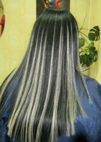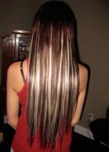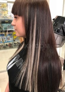 No less popular today is the extension of highlighted strands. As a rule, these are bright shining curls “striped” a little darker for a couple of shades. Some girls prefer not classical, but black-and-white highlighting. All of these options with proper execution look aesthetically pleasing and neat. In addition, strips of different tones on a long hairstyle visually make it even longer.