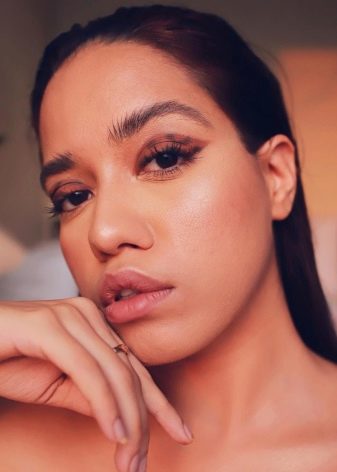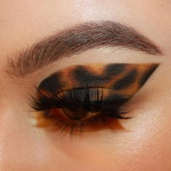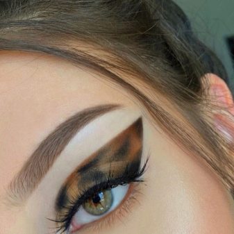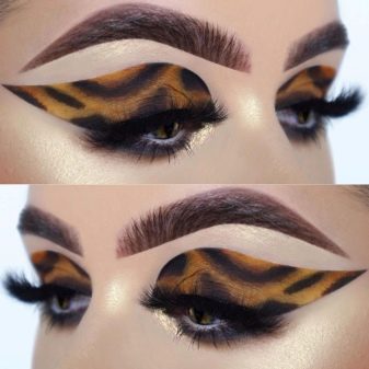 “Turtle” make-up is a combination of elongated black arrows with a pattern on the eyelids in brown-yellow and brown-orange colors.