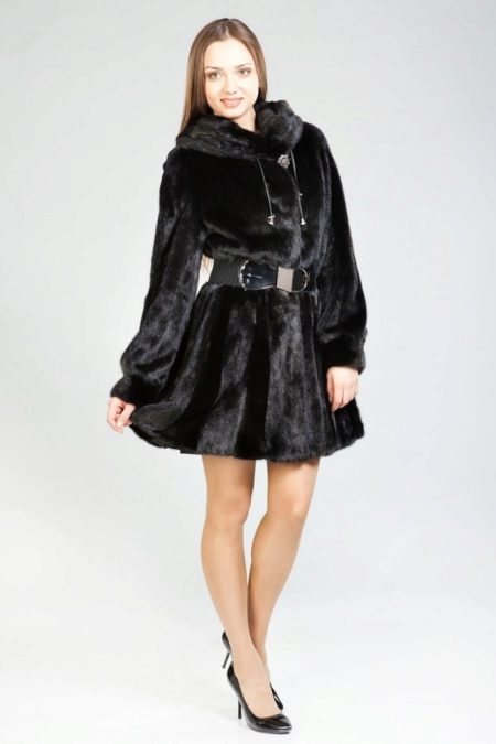A flared version of a shortened fur coat with a hood, sleeves on a cuff, with a wide belt is a laid-back option for a young girl.
