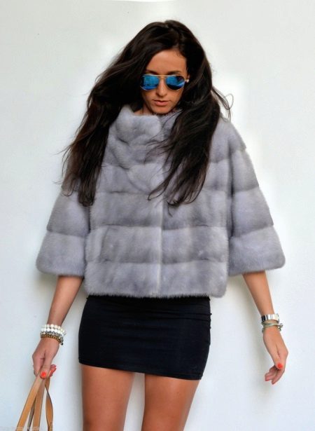 A short short fur coat of blue mink to the length of the belt is made by transverse stripes. A 3/4 cropped sleeve gives the model a modern and light feel. A stand-up collar accentuates the look. The color of the “blue mink” as if intended to emphasize the elegance of the model and the freshness of the image. This model for practical and young girls is suitable for all occasions - and on a date, and in the office and in the theater.