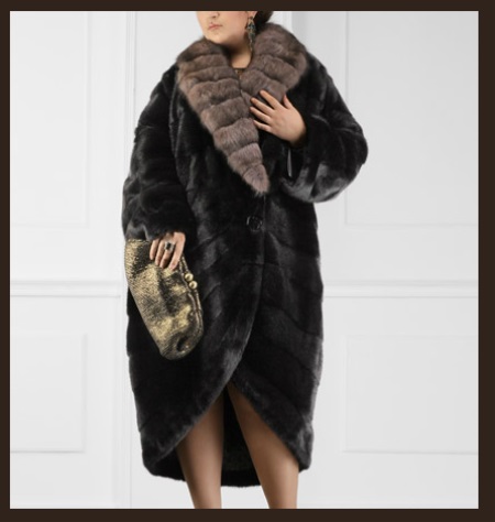 An interesting model of an oversized fur coat of dark mink below the knees with rounded floors. The floors are beveled from the knees in a semicircle, the fur coat is made in the transverse technique of stripes. Clasp in the form of a large decorative button. Noteworthy is the shawl collar trimmed with other long-pile fur in a similar transverse technique. Fur coat sleeves are long, straight and wide. Ideal for overweight women.