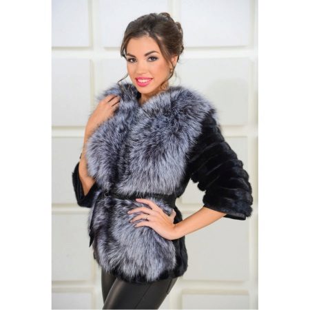 A very effective option for a bright, confident girl. The floors of a short coat have a wide edging with a silver fox. A stylish detail - a carelessly tied leather belt - emphasizes the waist, which is required in this model in order to balance the splendor of fox fur. The sleeves of the black mink-cross have a fashionable length of three quarters. Bright makeup and hairstyle of the girl (hair beautifully gathered upstairs) complete this charming image.