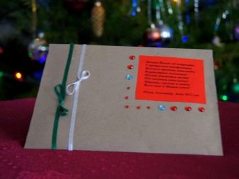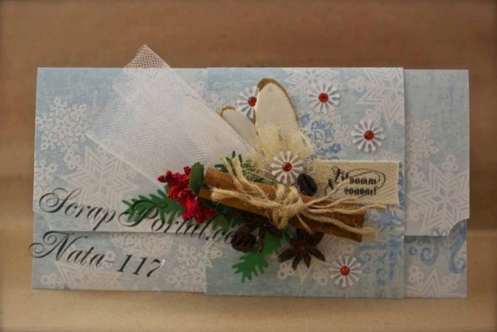 Making the New Year’s envelope, you must adhere to certain rules and make products according to templates and schemes. But you can achieve an equally good result by making a craft with your own design. An important part of the workflow is the decor of such products. For a beautiful design, you can use a lot of decorative elements. Even food and spices can be used.