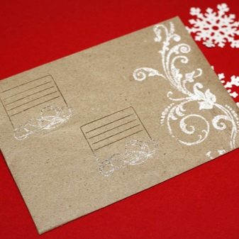 Even a minimal number of decorative elements will make an original congratulatory envelope. It is enough for this purpose to take kraft paper, fold it in the form of an envelope and apply a winter pattern with white paint.