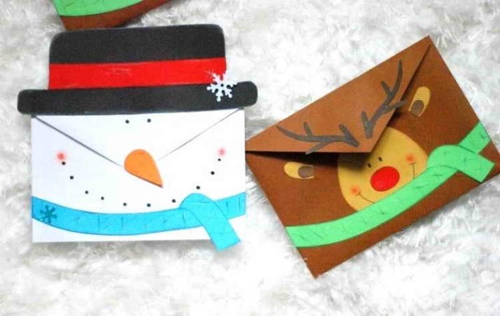 The easiest option for making crafts for the New Year is to purchase a ready-made envelope and decorate it. You can make it in the form of a deer face or the image of Santa Claus, having previously cut out the necessary details. To do this, a deer face with horns is glued to a clean envelope or a snowman outline is cut out, etc.