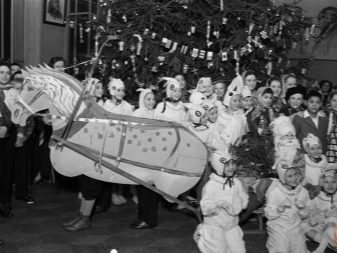 Events in honor of the New Year were also organized at enterprises. Instead of a lunch break, employees glued snowflakes on the windows, rehearsed rooms for a corporate concert. People with artistic talent painted a wall newspaper and holiday posters. Union leaders agreed on a venue and time for the event. Surely at a holiday there was Santa Claus and the Snow Maiden.