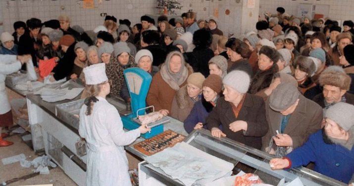 The shortage of many goods in Soviet times led to huge queues in stores. And for sure to get the goods they are interested in, the housewives in droves attacked the food stalls in advance.
