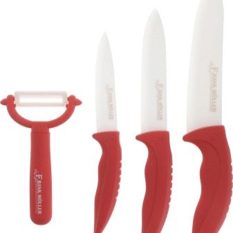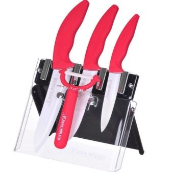 - "Frank Moller FM-364." For those who want to purchase a high-quality set of ceramic accessories, this option will be ideal. Products are manufactured by a German manufacturer and have a rather ergonomic and bright design. The knives included in the kit quickly cope with the cutting of any products and they do not need to be sharpened often. The standard set consists of a cook (blade length 15 cm), universal (12.5 cm) and a cleaning knife (10 cm). In addition, the kit is complemented by a convenient stand and a peeler.