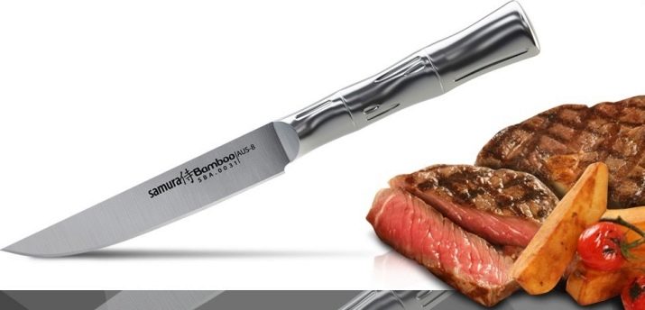 - For a steak. This tool, as a rule, is used for cutting and slicing a whole piece of meat (fried steak). It belongs to the additional types of knives, since it is usually used not in cooking, but for serving. The shape of the blade at this knife is oblong, the length is from 10 to 13 cm, the width is from 2 to 3 cm. The main feature of the tool is the presence of an even butt.