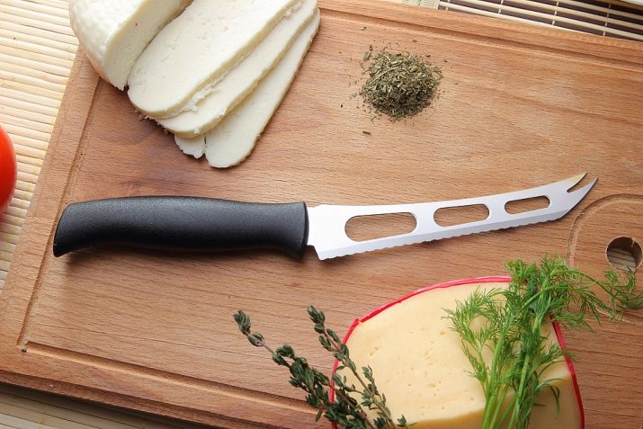 - For cheese. Chefs usually use several types of cheese knives in cutting, each of which is intended for a certain type of product (creamy, soft, hard). The tool has a wide but short blade. It is slightly narrowed in the middle of the blade and pointed at the top. The length of such a knife does not exceed 13 cm. Some models of products are available with a hole structure.