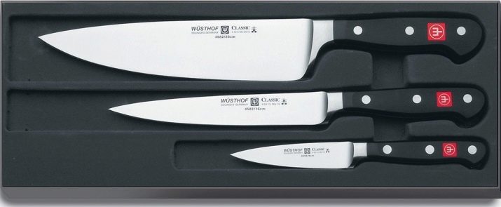 - The Chef's Three (manufacturer Wusthof). This set is characterized by the absence of unnecessary parts and perfect quality. The professional tools that come with the kit have rounded handle shapes and straight lines. Their design combines brilliant steel with black plastic. The blades are forged from corrosion-resistant steel, their sharpening angle is 20 degrees, the type of edge is double-sided.