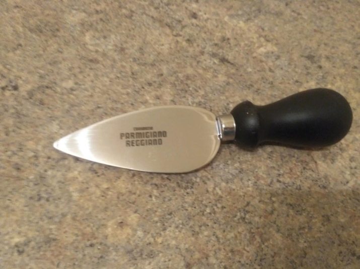 Parmesan is notable for its unusual properties: it is hard, but it is very brittle, it is easily divided into grains. Cut it completely unlike a regular knife tool. Rather, it looks like a plane and a chisel. The blade must have a large width, and it is necessary to apply special solutions that reduce the adhesion of chopped pieces. For this, either a Teflon coating is applied, or a special shape is made.