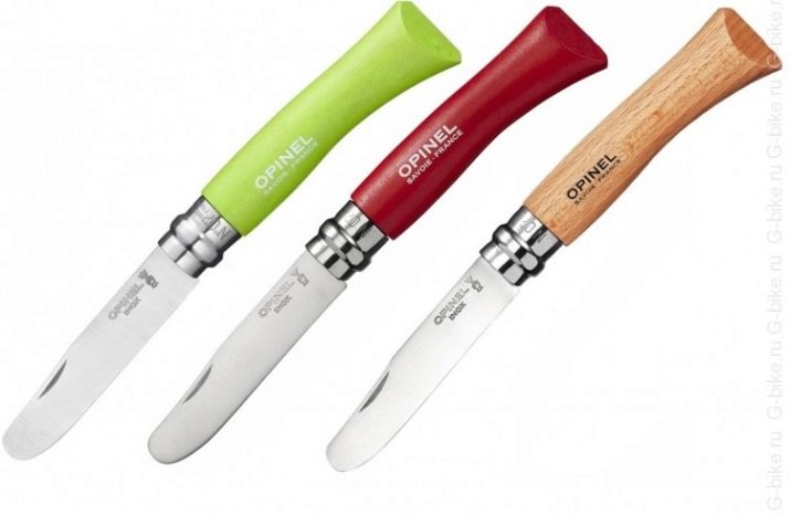 - Baby My first Opinel. Folding knives suitable for teaching a child how to safely and properly handle cutting objects. They are a beech handle and a steel blade with a rounded end 8 cm long. They are equipped with a “Viroblock” lock. Suitable for cooking, working with wood and making crafts.