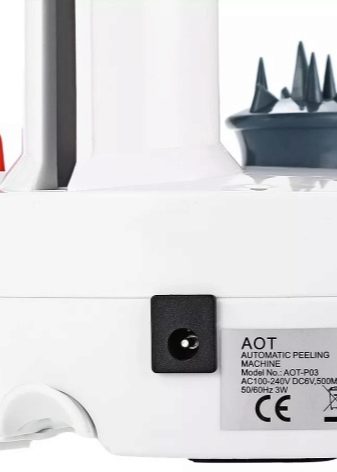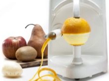 - AOT versions of p03 - Chinese automatic peeler. Its peculiarity lies in the fact that only one fruit can be peeled at a time. At the same time, purification proceeds in a spiral, quickly, efficiently and does not depend on the shape of the fetus. The device is easy to use, compact in storage.